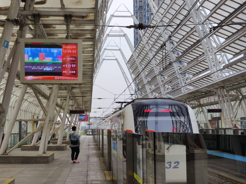 先坐上往东海路方向的列车,前往终点站。9 号线地上段的车站整体布置都比较简单,也能看出时代的气息,但东海路站则是一个例外。这是因为东海路站是一座浴血重生后的车站。